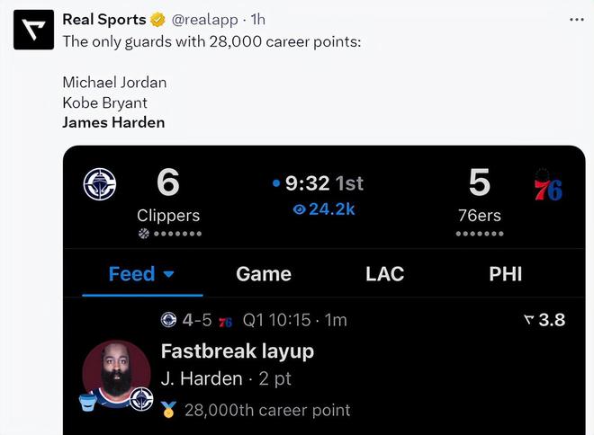 美媒写道,NBA历史上拿到28000分以上的得分后卫只有乔丹、科比、哈登三人。